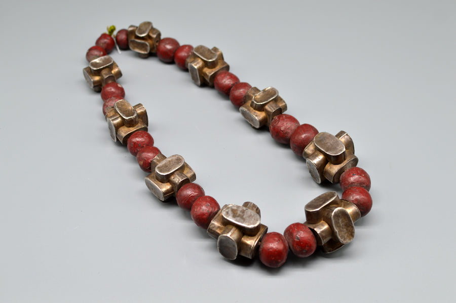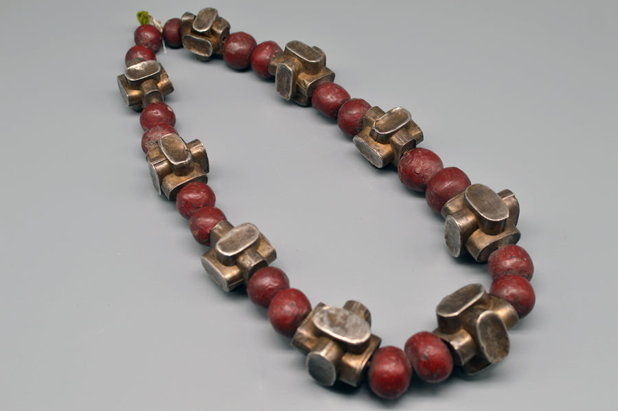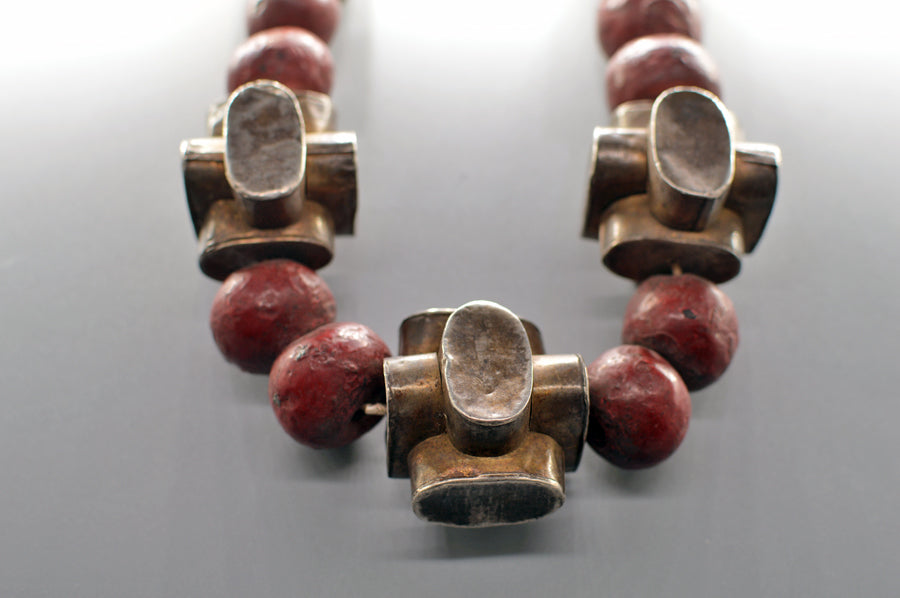 Terracotta beads diameter 2cm and silver geometric beads 3,5cm maximum 4cm.